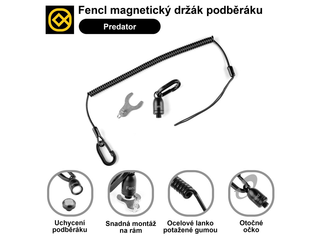Fencl magnetický držák Predator je určený pro teleskopické přívlačové podběráky značky Fencl. Ve spodní části magnetu je rybářský závit, díky kterému můžeme magnet pohodlně a snadno našroubovat na podběrák a využít tak magnetického zavěšení pro větší komfort při rybolovu.