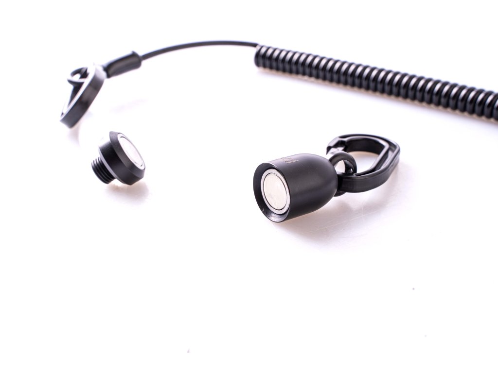 Otočná očka o 360 stupňů, dvě karabiny pro maximální komfort odepínání například při focení s rybou. Ocelové pojistné lanko potažené gumou.