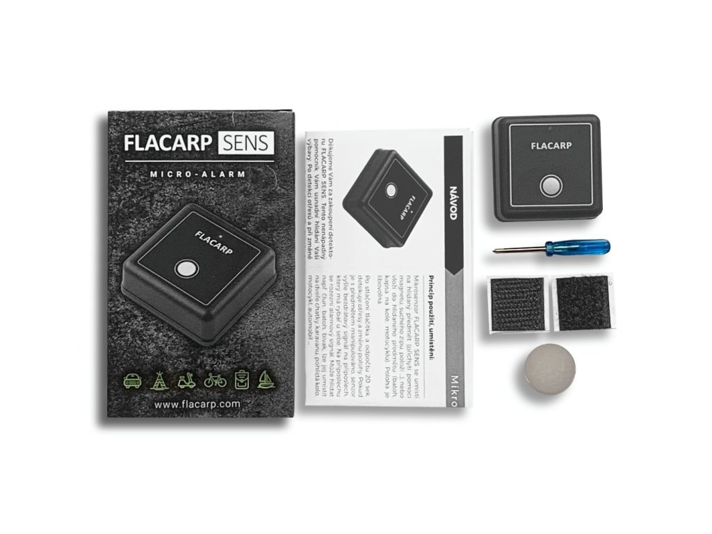 Nový miniaturní alarm, detekuje změnu polohy a vibrace. Vysílá signál na příposlech RX7 (RFX). Pomůže pohlídat vaši výbavu: člun, batoh, zaparkovaný motocykl, auto, můžete pohlídat kolo nebo jej připevnit na dveře karavanu nebo chatky. Při detekci změny polohy, vibrací nebo otřesů vyšle signál na váš bezdrátový příposlech. Vlastnosti a funkce: - rozměry jen 4 x 4cm, výška 1,5cm - napájení knoflíkovou baterií CR2450 - dosah bezdrátového signálu až několik stovek metrů (dle terénu a umístění) - možnost nastavení citlivosti dle použití Ovládání je velmi jednoduché a intuitivní: - stlačením tlačítka zapnout, odpočet času 5 sekund - po odpočtu hlídá: detekuje vibrace a změnu polohy - pro vypnutí opět stlačit tlačítko ... - při vypnutí vždy vyšle signál na příposlech, nelze tedy jednoduše překonat bez upozornění uživatele Na posledním obrázku ukázka uložení tří čidel FLACARP-SENS v kufru XXL.